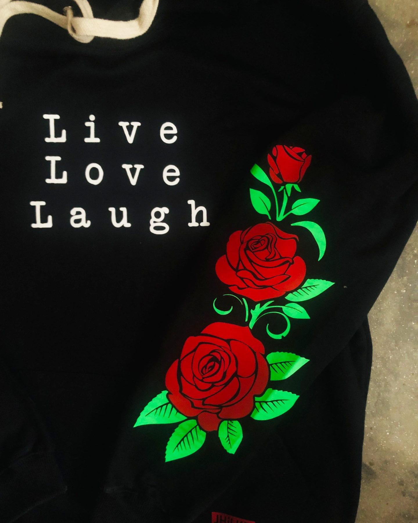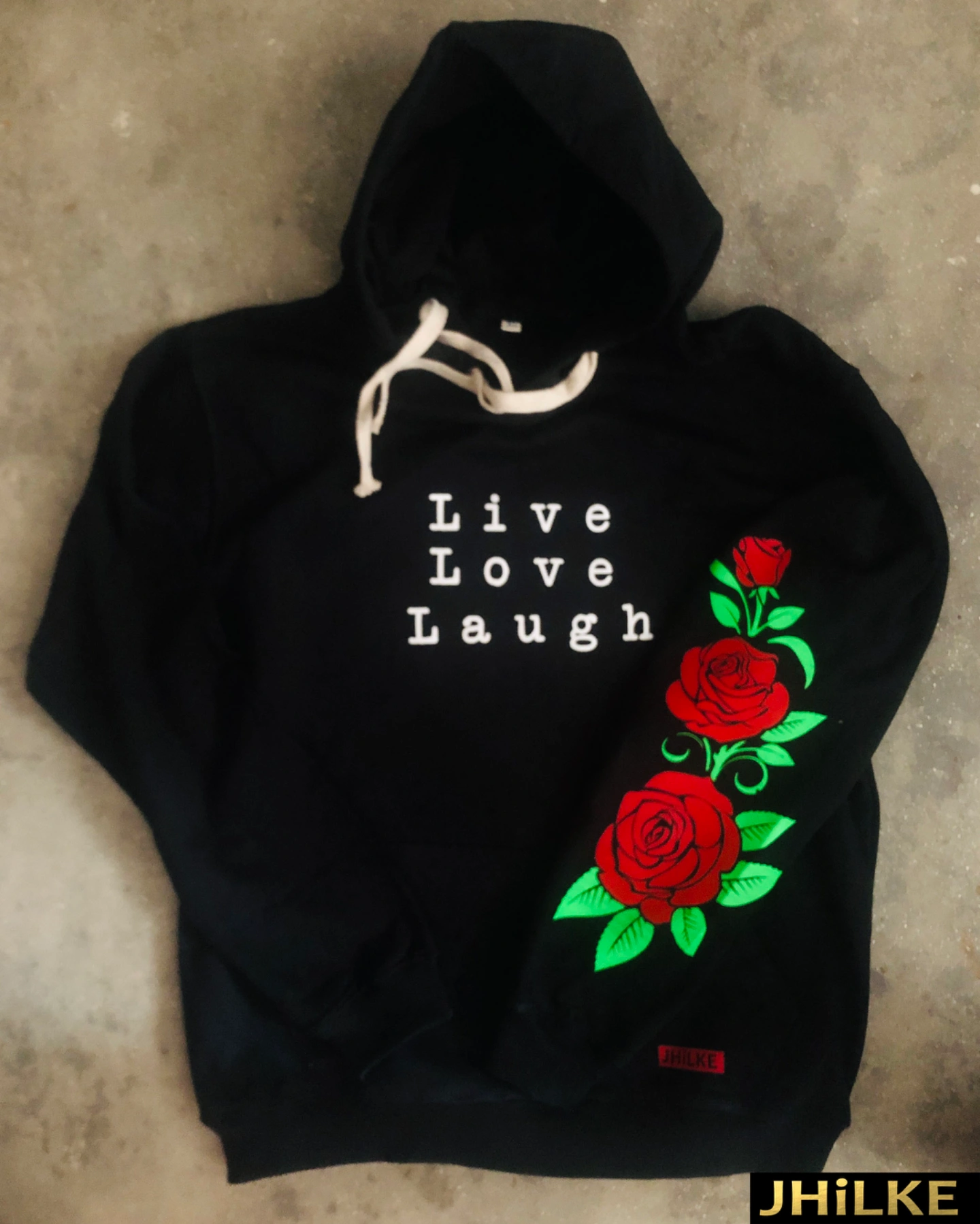 Live Love Laugh Pullover Hoodie – Black with Floral Sleeve Print | Made in Nepal